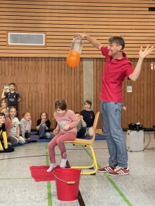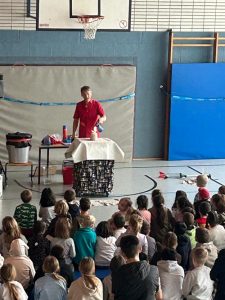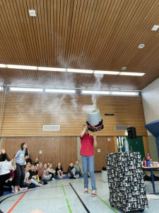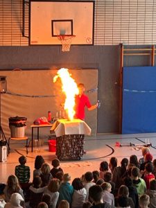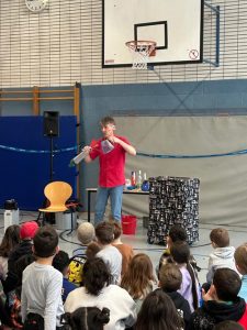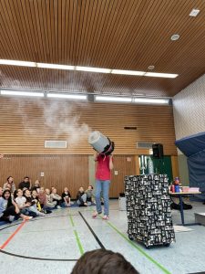 Was für ein Auftakt! Um unsere diesjährige MINT-Projektwoche (Mathematik, Informatik, Naturwissenschaft und Technik) gebührend einzuläuten, verwandelten sich die Turnhallen an beiden Standorten für jeweils eine Stunde in eine spektakuläre Experimentier-Bühne.